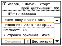 <Да>.Ако сте задали групово набиране на стъпка 2, се показва "XX дестинация(и)". Докосването на <Брой дестинации > показва дестинациите, запаметени в групата.