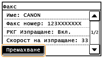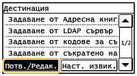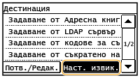 Когато за <Огран. повт. изпр. от регистър> е зададена настройка <Вкл.>, не можете да използвате тази функция. Деактивиране на задаването на използвани по-рано дестинации