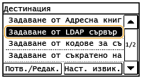 Ако имате инсталиран LDAP сървър в офиса, можете да посочите дестинация, като използвате информацията за потребителите в сървъра. Осъществете достъп до LDAP сървъра от устройството, за да потърсите подходящата информация за потребител и да я посочите като дестинация.