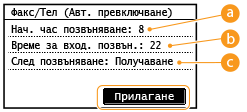 Можете да зададете настройки за автоматично получаване на факс документи след определена продължителност на звънене при входящо повикване. Превключване към автоматично получаване