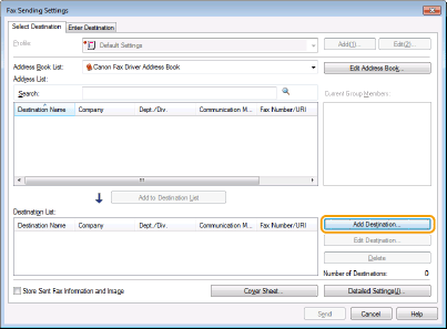 Задайте [Destination Name]/[Communication Mode]/[Fax Number/URI]/[Fax Number] и щракнете [OK].