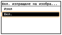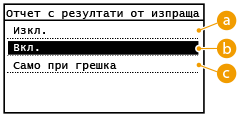 Ако изберете <Вкл.> или <Само при грешка>, част от факс документа може да бъде включена в отчета. Докоснете <Вкл. изпращане на изображение>, за да зададете <Вкл.>. Но задачите, изпратени от факс драйвер, няма да бъдат включени в този отчет.