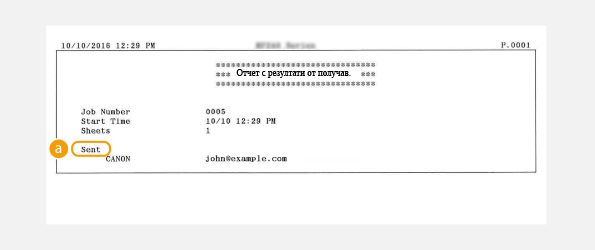 Можете да проверите резултатите от комуникацията за изпращане на имейли и съхраняване на документи в споделена папка, като отпечатате отчет за изпращане на имейл/файл. Отчетът може да бъде отпечатан или след всяко изпращане, или само при възникване на грешка при изпращането.