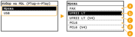 Изберете език за описание на страници, така че машината да се разпознава като принтер, който е съвместим с този език, когато я свързвате към компютър чрез функцията "Plug and Play".