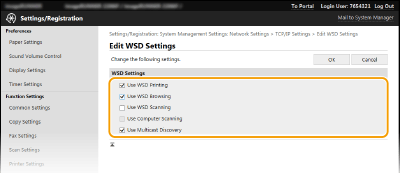 Поставете отметка в квадратчето, за да използвате WSD сканиране чрез контролния панел на машината. В това квадратче може да бъде поставяна отметка само когато е поставена отметка за [Use WSD Scanning] (Използвай WSD сканиране). За да сканирате, докоснете <Сканиране> и задайте свързан с WSD компютър като дестинация за сканиране. (Сканиране чрез машината). [Use Multicast Discovery]