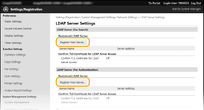 Щракнете върху [Register New Server] за [LDAP Server (For Search)] или [LDAP Server (For Authentication)].