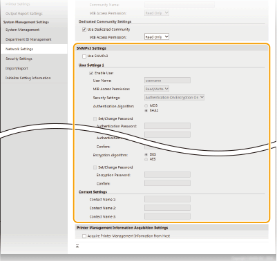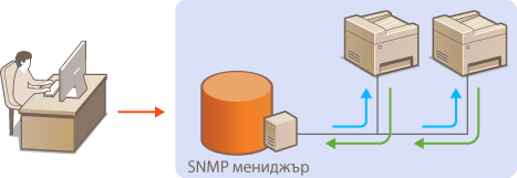 Протоколът SNMP (Simple Network Management Protocol) е протокол за наблюдение и управление на комуникационни устройства в мрежата чрез MIB (Management Information Base). Машината поддържа SNMPv1 и SNMPv3, чиято сигурност е подобрена. Можете да проверите състоянието на машината от компютър, когато отпечатвате документи или използвате потребителския интерфейс за отдалечено управление. Можете да активирате или SNMPv1, или SNMPv3, или и двата протокола едновременно. Задайте настройките за всяка версия според мрежовата среда и целите си.