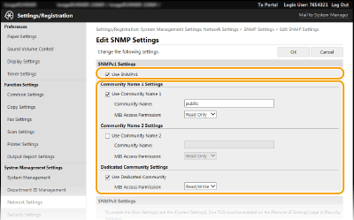 Ако и двете версии на SNMP са активирани, е препоръчително за разрешение за достъп до MIB в SNMPv1 да зададете [Read Only]. Разрешение за достъп до MIB може да бъде зададено отделно за SNMPv1 и SNMPv3 (и за всеки потребител в SNMPv3). Ако зададете [Read/Write] (разрешение за пълен достъп) в SNMPv1, надеждните настройки за сигурност в SNMPv3 ще бъдат обезсилени, тъй като повечето настройки на машината ще могат да бъдат управлявани чрез SNMPv1.