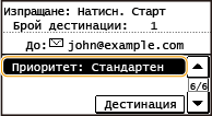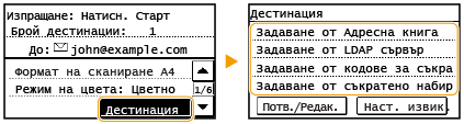 Когато задавате няколко дестинации, втората и следващите дестинации трябва да бъдат запаметени в адресната книга. Що се отнася до Cc и Bcc, можете да посочвате само дестинации, запаметени в адресната книга. За да използвате адресната книга, трябва предварително да сте попълнили необходимите дестинации.