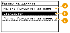 Можете да изберете степента на компресиране на файловете, когато конвертирате сканирани документи в JPEG формат. Настройката <Малък: Приоритет за памет> задава по-висока от нормалната степен на компресия за създаване на файлове с по-малък размер и по-ниско качество на изображението. От друга страна, настройката <Голям: Приоритет за качество изображение> задава по-ниска от нормалната степен на компресия за създаване на файлове с по-голям размер и по-високо качество на изображението.