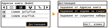 Трицифрени номера (кодове за съкратено набиране) се присвояват към адресите в адресната книга. Можете да посочите адрес, като въведете неговия код за съкратено набиране.