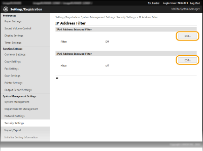 Ако IP адресите са въведени неправилно, може да не успеете да отворите машината от потребителския интерфейс за отдалечено управление, като в този случай е необходимо да зададете за <Филтър за IPv4 адрес> или <Филтър за IPv6 адрес> настройка <Изкл.>. Филтър за IPv4 адрес Филтър за IPv6 адрес