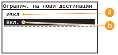 Чрез ограничаване на факс номерата и имейл адресите, които могат да бъдат задавани при изпращане на документи до тези, които вече са запаметени в адресната книга, тези, използвани по-рано, или тези, които се търсят чрез LDAP сървъри, може да се намали възможността за задаване на неправилни дестинации и да се предотврати изтичането на информация. Когато тази функция е активирана, машината забранява на потребителите да въвеждат дестинации чрез бутоните с цифри, да добавят нови записи в адресната книга и да редактират съществуващите записи в адресната книга.