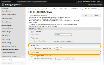 Необходимите настройки са почти същите като тези на TTLS. За вътрешен протокол се използва MS-CHAPv2. Активирайте TLS за Remote UI (Потребителски интерфейс за отдалечено управление), преди да конфигурирате този метод за удостоверяване (