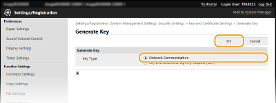 Двойка ключове може да бъде генерирана чрез устройството, когато е необходимо за шифрованата комуникация чрез Transport Layer Security (TLS). Можете да използвате TLS, когато осъществявате достъп до устройството чрез Remote UI (Потребителски интерфейс за отдалечено управление). За машината могат да бъдат генерирани до пет двойки ключове (включително предварително инсталираните двойки ключове). Самоподписаните сертификати се използват с двойки ключове, генерирани в "Network Communication". Чрез "Key and Certificate Signing Request (CSR)" можете да кандидатствате за издаден от СА цифров сертификат за генерираната от машината двойка ключове.