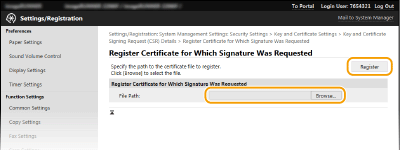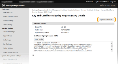 Не можете да използвате двойката ключове, генерирана от заявката за подписване на сертификат (CSR), докато сертификатът не бъде регистриран. След като сертифициращият орган издаде цифровия сертификат, го запаметете в машината, като изпълните долната процедура.