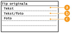 Možete odabrati optičku kvalitetu slike za kopiju u skladu s vrstom dokumenta, npr. za dokumente koji sadrže samo tekst, dokumente koje sadrže dijagrame i grafikone ili pak slike iz časopisa.