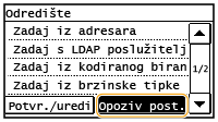 Ako je mogućnost <Ograniči ponovno slanje iz dnevnika> postavljena na <Uključeno>, tu značajku nije moguće koristiti. Onemogućivanje korištenja prethodno korištenih odredišta
