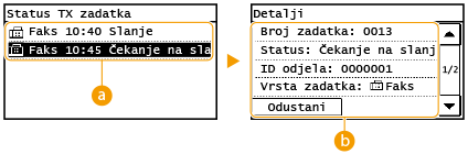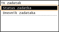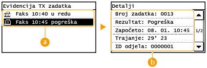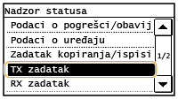 ![]() <Evidencija TX zadatka>/<Evidencija RX zadatka>Prikazuje popis primljenih i poslanih dokumenata. Ako je dokument uspješno poslan ili primljen, prikazuje se <U redu>, a ako se dokument nije uspio poslati ili primiti jer je poništen ili je došlo do pogreške, prikazuje se <Pogreška>.