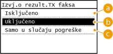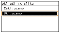 Kada odaberete <Uključeno> ili <Samo u slučaju pogreške>, u izvješće možete uvrstiti dio faksa. Dodirnite <Uključi TX sliku> na <Uključeno>. Međutim, zadaci slanja koji potječu iz upravljačkog programa faksa izostavljeni su iz tog izvješća.