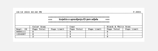 Ako je aktivirano upravljanje ID-brojem odjela, možete ispisati izvješće kako biste po ID-brojevima odjela provjerili ukupan broj kopiranih, ispisanih i skeniranih stranica. Izvješće vam omogućuje nadgledanje uporabe i unapređenje upravljanja.