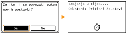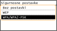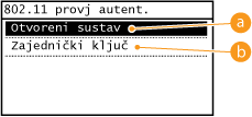 ![]() Kad je odabrana opcija <Otvoreni sustav> Prilikom povezivanja s bežičnim LAN-om, u uređaju će se pojaviti pogreška provjere autentičnosti ako je na bežičnom usmjerivaču postavljena provjera autentičnosti putem zajedničkog ključa. Ako se to dogodi, uređaj će automatski promijeniti postavku u <Zajednički ključ> i ponovno pokušati uspostaviti vezu. |