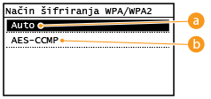 ![]() <Auto>Postavlja uređaj da automatski odabire AES-CCMP ili TKIP koji odgovara postavkama bežičnog usmjerivača.