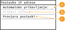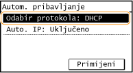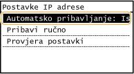 ![]() ![]() Ako ne želite IP adresu dodjeljivati pomoću protokola DHCP/BOOTP/RARP Odaberite <Isključeno>. Ako <DHCP>, <BOOTP> ili <RARP> odaberete kada nisu dostupni, uređaj će trošiti vrijeme i komunikacijske resurse na traženje tih servisa na mreži. |