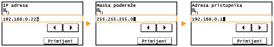 <Maska podmreže> <Adresa pristupnika>.Unesite svaku postavku pomoću numeričkih tipki, a zatim dodirnite <Primijeni>.