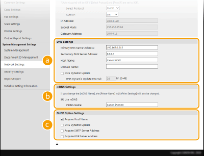 Protokol mDNS (višesmjerni DNS), koji se koristi u značajci Bonjour, protokol je za povezivanje naziva glavnog računala i IP adrese bez korištenja DNS-a. Da biste omogućili mDNS, potvrdite okvir i unesite naziv mDNS-a u tekstni okvir [mDNS Name]. [DHCP Option Settings][Acquire Host Name]