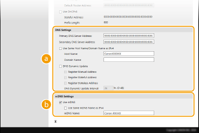 Potvrdite okvir da biste dinamično ažurirali DNS zapise pri svakoj promjeni IP adrese uređaja. Da biste definirali vrstu ili vrste adresa koje želite registrirati na DNS poslužitelju, potvrdite okvir za [Register Manual Address], [Register Stateful Address] ili [Register Stateless Address]. Da biste definirali razdoblje između ažuriranja, unesite vrijeme u satima u tekstni okvir [DNS Dynamic Update Interval]. [mDNS Settings][Use mDNS]