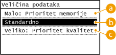 Možete odrediti omjer kompresije datoteke kada pretvarate skenirane dokumente u oblik JPEG. <Malo: Prioritet memorije> povećava omjer kompresije u odnosu na uobičajeni radi stvaranja manjih datoteka s manjom kvalitetom slike. S druge strane, <Veliko: Prioritet kvalitete slike> smanjuje omjer kompresije u odnosu na uobičajeni radi stvaranja većih datoteka i veće kvalitete slike.