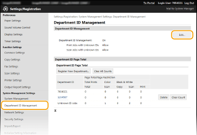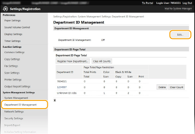 Kliknite na [Department ID Management] i registrirajte (ili uredite) ID-brojeve odjela.