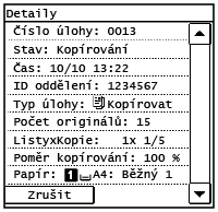 Umožňuje zobrazit aktuální stav vybraných položek. Jako příklad je níže uvedena obrazovka <Stav kopírovací/tiskové úlohy>.