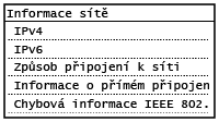 Zobrazuje nastavení sítě, jako je adresa IP zařízení, a stav, například komunikací v bezdrátové síti LAN.