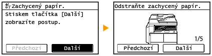 V některých případech se po výskytu chyby zobrazí postup, jak na chybu reagovat. Podle pokynů na obrazovce problém vyřešte. Jako příklad je níže uvedena obrazovka, která se objeví, když dojde k zachycení papíru (