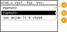 Můžete si nechat vytisknout hlášení o výsledku VYS odeslání faxů a zkontrolovat výsledky komunikace. Hlášení lze vytisknout vždy po dokončení přenosu nebo pouze ve chvíli, kdy dojde k chybě.
