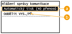 Klepněte na <Zapnuto>, chcete-li vytisknout hlášení automaticky vždy po uskutečnění 40 přenosů, nebo <Vypnuto>, pokud nechcete tisknout hlášení automaticky.