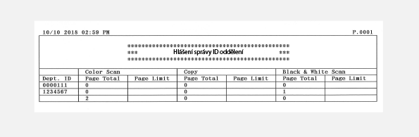 Když je aktivována správa ID oddělení, pro každé ID oddělení si můžete pro kontrolu vytisknout hlášení s celkovým počtem okopírovaných, vytištěných a naskenovaných stránek. S pomocí hlášení můžete sledovat využívání zařízení a zlepšit jeho správu.