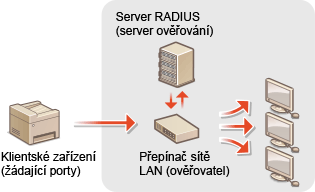 Zařízení se může k síti 802.1X připojit jako klientské zařízení. Typická síť 802.1X sestává se serveru RADIUS (ověřovací server), přepínače LAN (ověřovatel) a klientského zařízení se softwarem umožňujícím ověření (žádající porty). Pokud se zařízení pokusí připojit k síti 802.1X, musí projít procesem ověření uživatele, který prokáže, zda se o připojení pokouší autorizovaný uživatel. Informace pro ověření jsou odeslány ke kontrole na server RADIUS, který na základě výsledku ověření buď povolí, nebo odmítne komunikaci se sítí. Pokud se ověření nezdaří, přepínač LAN (nebo přístupový bod) zablokuje přístup z vnější sítě.