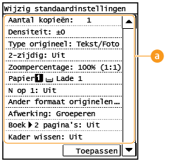 drukt. Als u deze standaardinstellingen afstemt op de bewerkingen die u regelmatig uitvoert, kunt u tijd besparen doordat u niet steeds dezelfde instellingen hoeft te configureren als u gaat kopiëren.