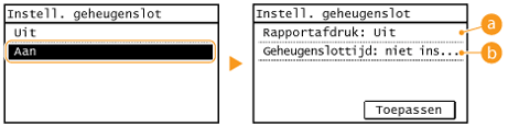 Om ontvangen documenten in het geheugen op te slaan, stelt u <Instellingen geheugenslot> in op <Aan>. U kunt ook optionele instellingen opgeven, zoals het instellen van periode waarbinnen gedurende de dag ontvangen documenten in het geheugen moeten worden opgeslagen.