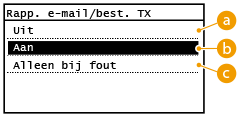 U kunt de communicatieresultaten van verzending van e-mails controleren en documenten opslaan in een gedeelde map door een e-mail/bestand TX-resultaatrapport af te drukken. U kunt het rapport afdrukken na elke transmissie of alleen als er een verzendfout optreedt.