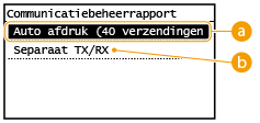 Tik op <Aan> om afzonderlijke rapporten af te drukken voor verzonden en ontvangen documenten, of op <Uit> om verzend- en ontvangstgegevens te combineren in één rapport.