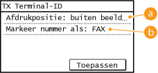 Hiermee bepaalt u waar op de verzonden fax de toegevoegde gegevens worden afgedrukt. Selecteer <Binnen beeldvlak> om de gegevens binnen het beeldvlak af te drukken of <Buiten beeldvlak> om de gegevens buiten het beeldvlak te plaatsen.
