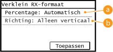 Hiermee kunt u instellingen opgeven voor het verkleinen van een ontvangen document. U kunt een verkleiningspercentage selecteren dat automatisch wordt toegepast om het ontvangen document te verkleinen tot het formaat van het geladen papier. U kunt ook een percentage selecteren in een lijst.