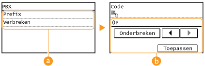 Selecteer het type telefooncentrale dat u gebruikt. Als u <Prefix> selecteert, voert u het kengetal op het volgende scherm in.