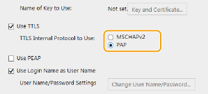 Nõutavad seaded on peaaegu samad kui TTLS-protokollil. Sisemise protokollina kasutatakse MS-CHAPv2-protokolli. Lubage enne selle autentimisviisi konfigureerimist rakenduse Remote UI (Kaugkasutajaliides) jaoks TLS (