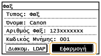Το όνομα χρήστη και ο αριθμός φαξ ή η διεύθυνση e-mail που έχουν καταχωρηθεί στον διακομιστή LDAP του επιλεγμένου χρήστη είναι καταχωρημένα στο Βιβλίο διευθύνσεων.