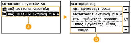 ![]() <Κατάσταση Εργασιών ΑΠ>/<Κατάσταση Εργασιών ΛΨ>Εμφανίζει μια λίστα των εγγράφων που αποστέλλονται και λαμβάνονται ή βρίσκονται σε αναμονή για επεξεργασία.